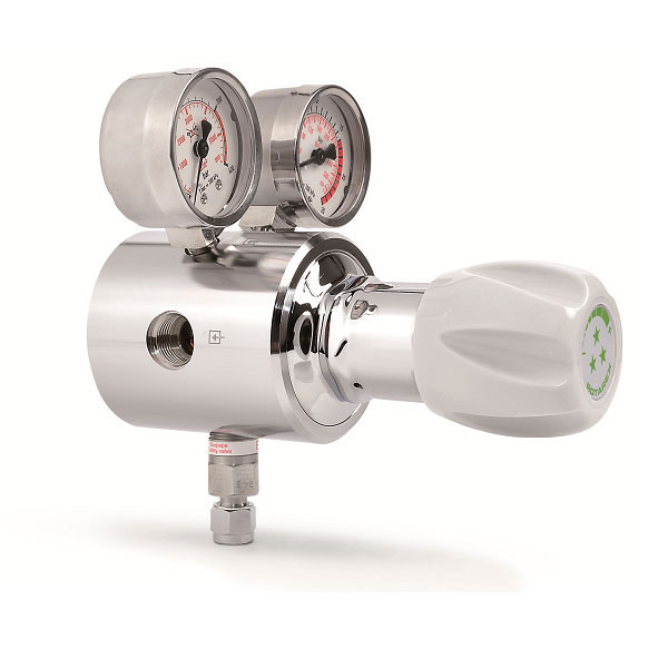S800 high pressure cylinder regulator is designed for purity gases and high-pressure applications requiring high flow and precise outlet pressure, such as laser applications. It is also suited for nuclear research departments where the precision of the outlet pressure and high flow are essential. A cylinder connector is necessary to connect it to the cylinder valve.